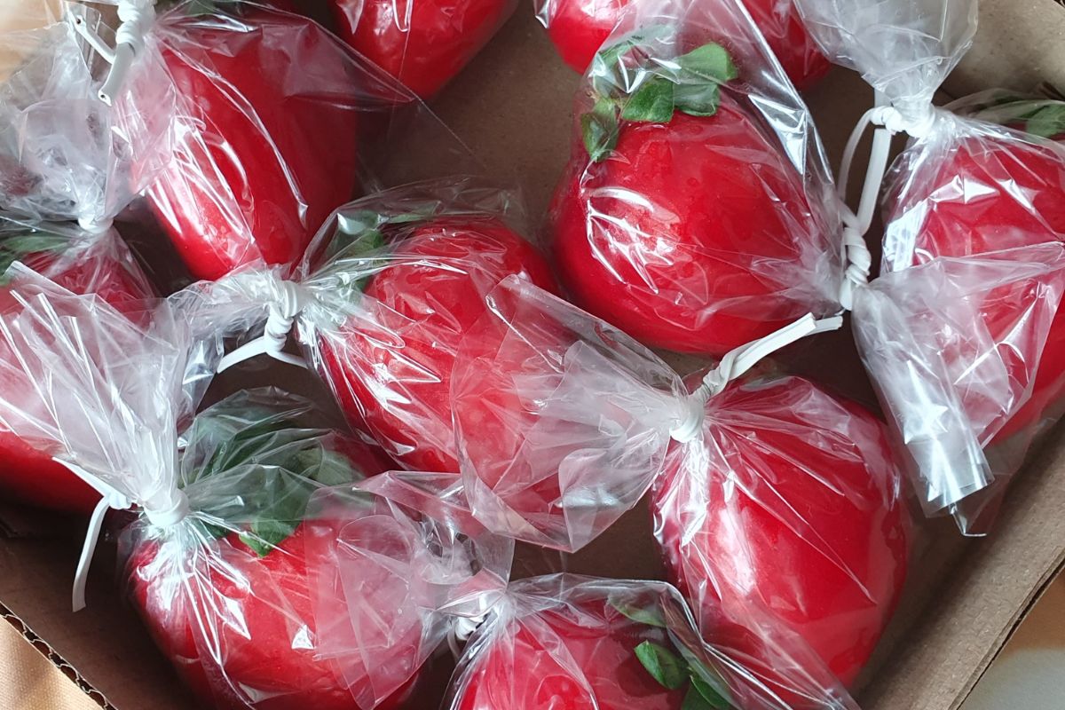Assim, os morangos não precisam estar frios para embalar, use os talinhos de morango reservados para decorar a pontinha de cada um. Isso dá um charme todo especial! Então, em seguida, embale cada Morango do Amor individualmente em sacos poli transparentes. Enfim, feche a embalagem com uma fita para um acabamento perfeito. Estão prontos para encantar!